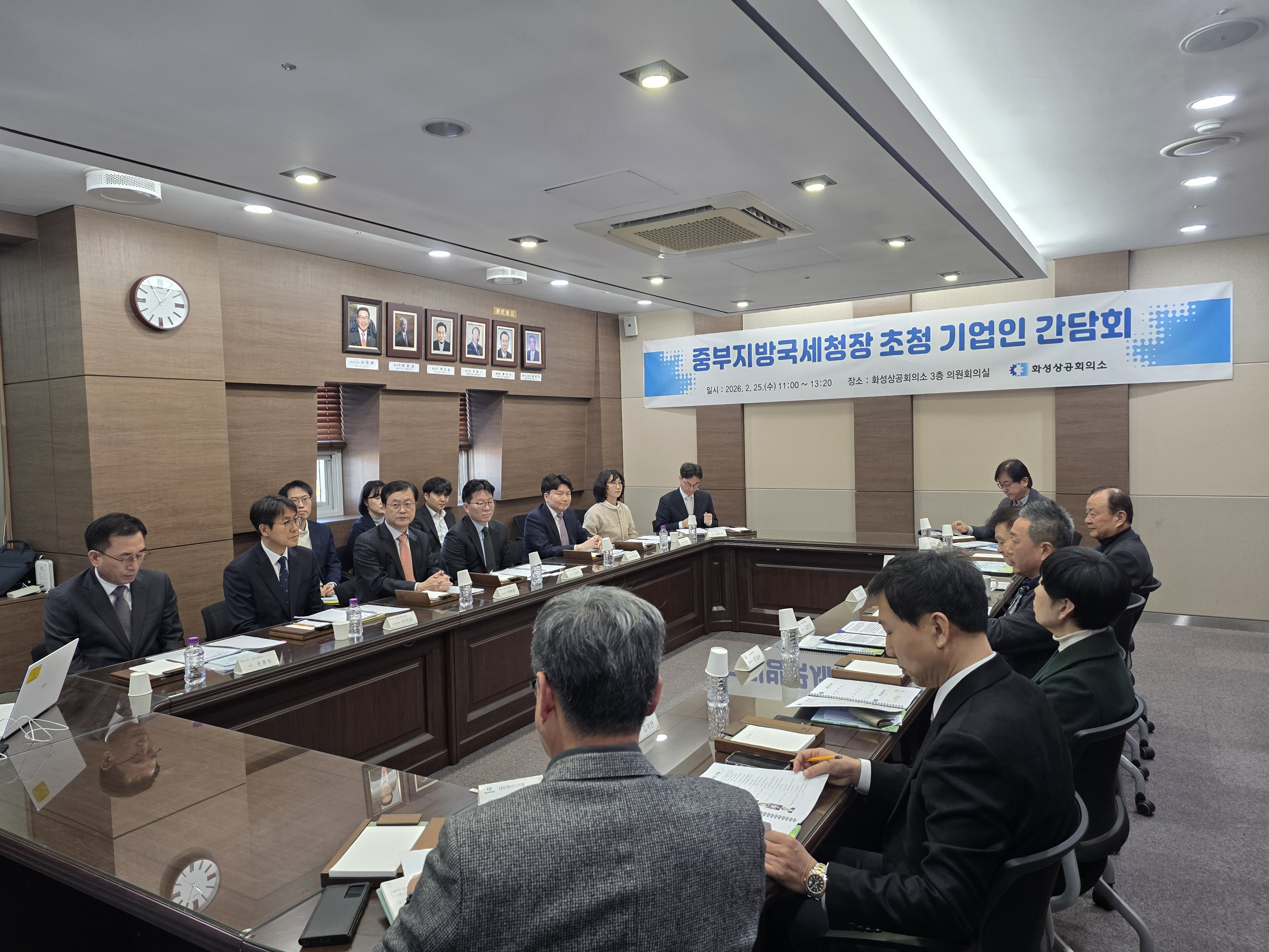 화성상공회의소, 이승수 중부지방국세청장 초청 기업인 간담회 개최- 중부청 및 화성 기업인 등 15명 참석, 경영 현장의 세무 애로사항 건의 및 답변 진행 - ESG 경영 세제 지원, 자녀 보육수당 비과세 확대, 가업승계 요건 완화 등 논의