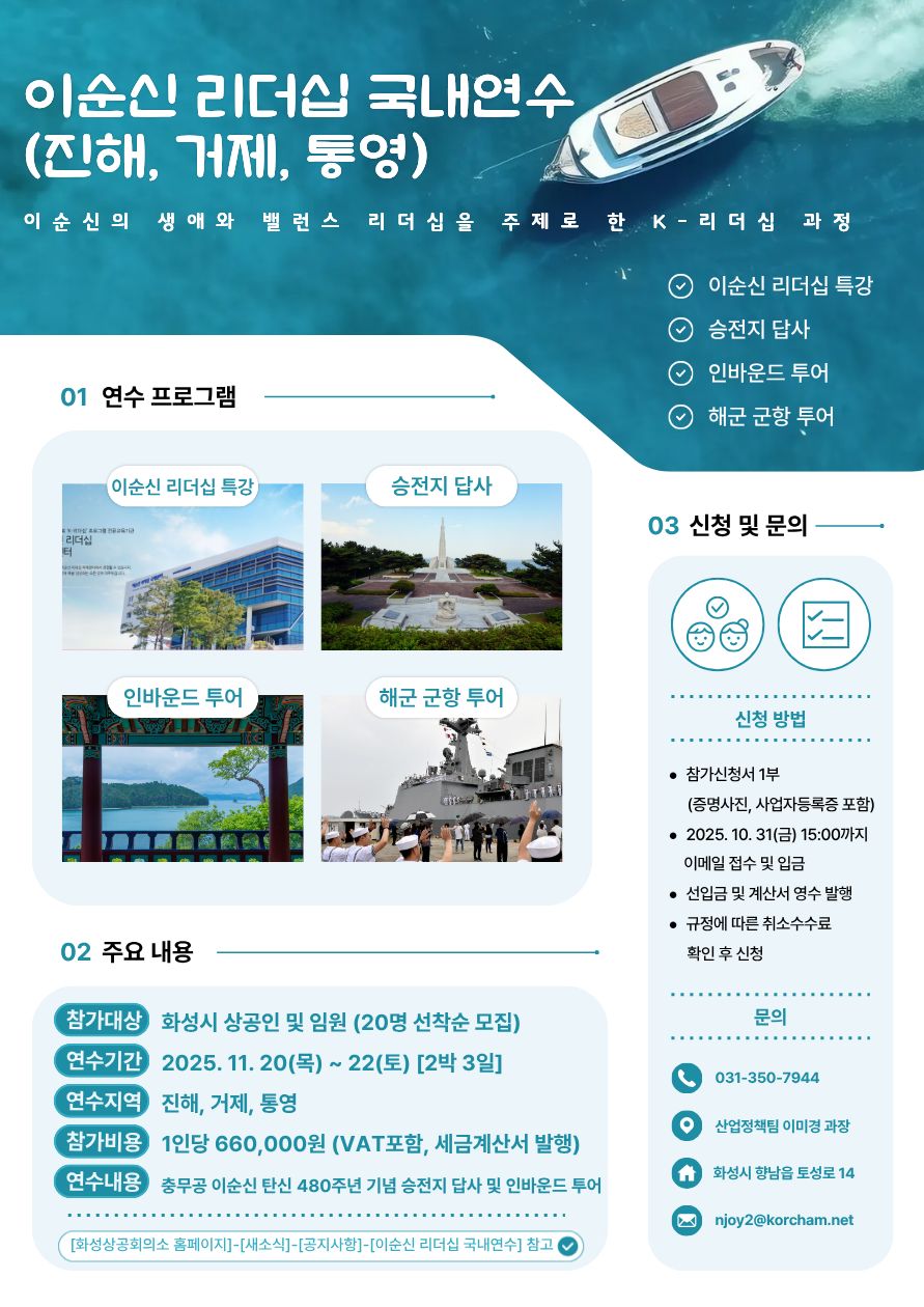 ‒ | [공지] 2025년 화성상공회의소 상공인 이순신 리더십 국내연수(진해, 거제, 통영) 안내 |