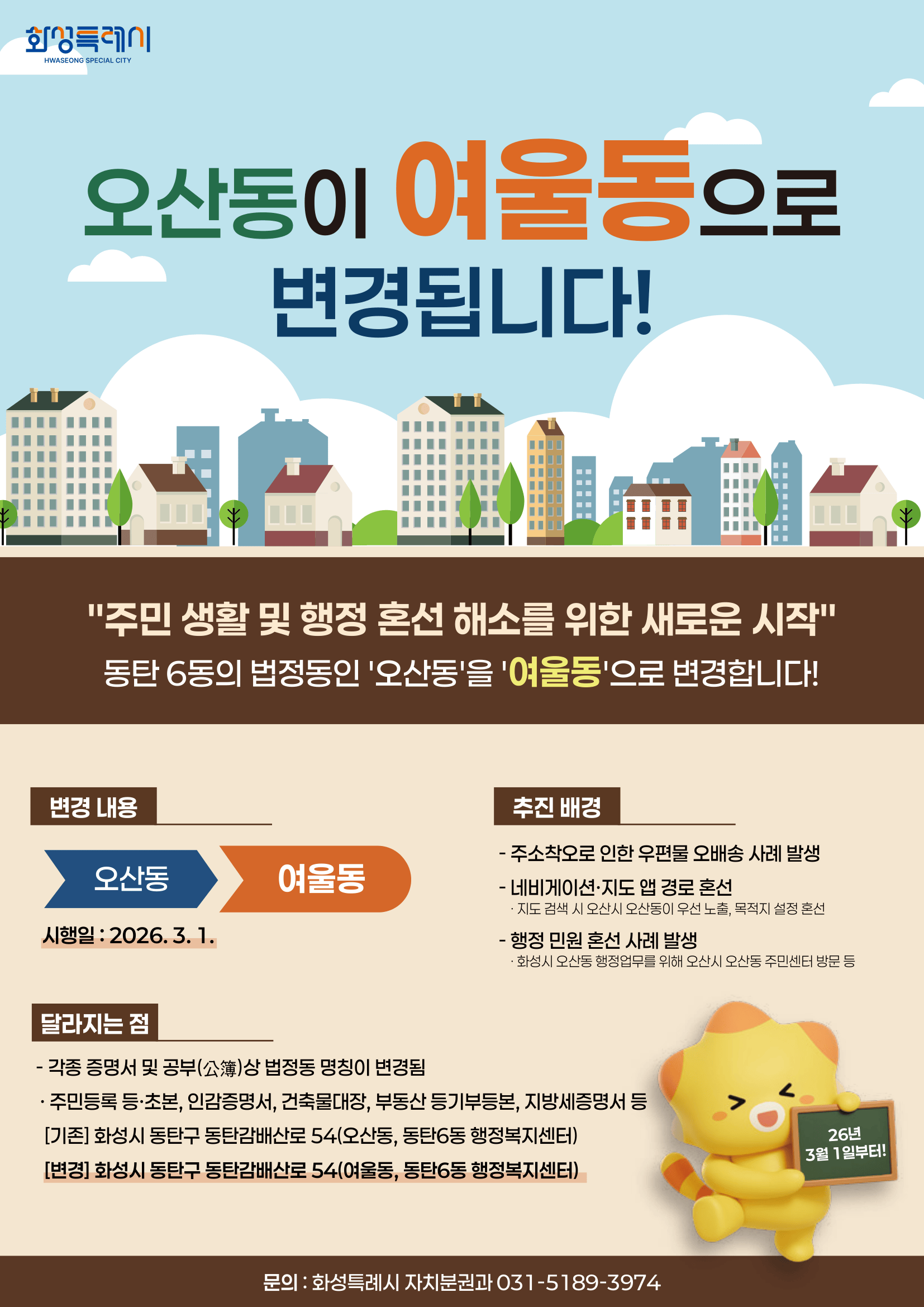 | 제목 | [화성특례시] 화성시 행정구역(법정동) 명칭 변경 알림(오산동→여울동) | ||