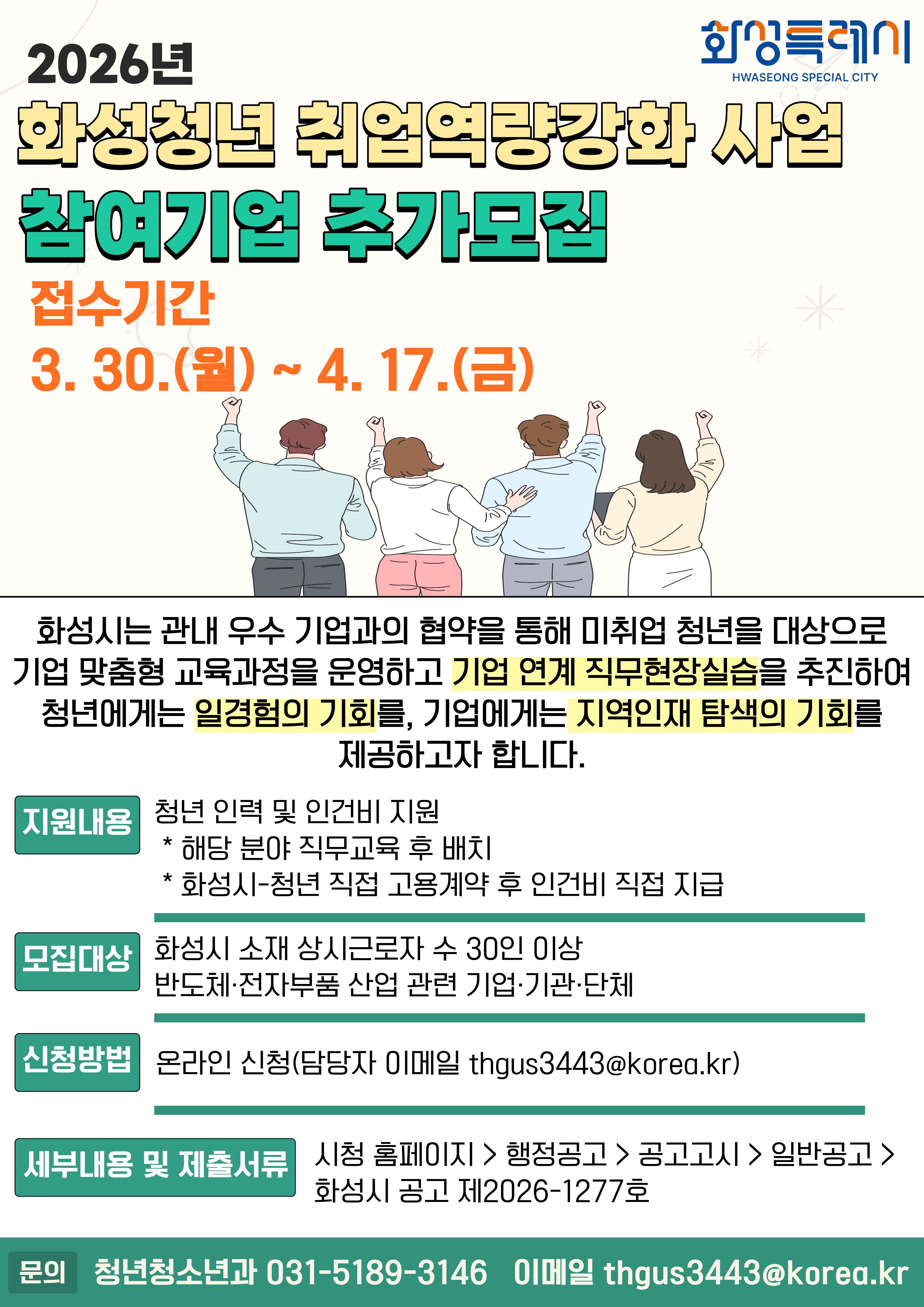 | 제목 | [화성특례시] 「2026년 화성청년 취업역량강화 사업」 참여기업 추가 모집 안내 | ||