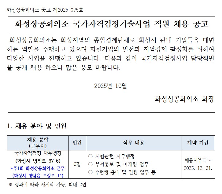 ‒ | 화성상공회의소 국가자격검정기술사업 직원 채용 공고 (2025-75호) |