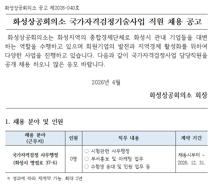 | 제목 | 화성상공회의소 국가자격검정기술사업 직원 채용 공고 (2026-40호) | ||