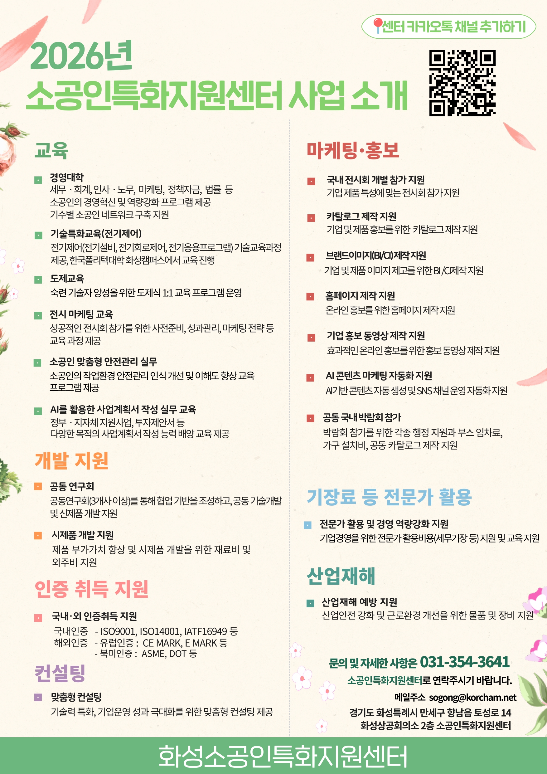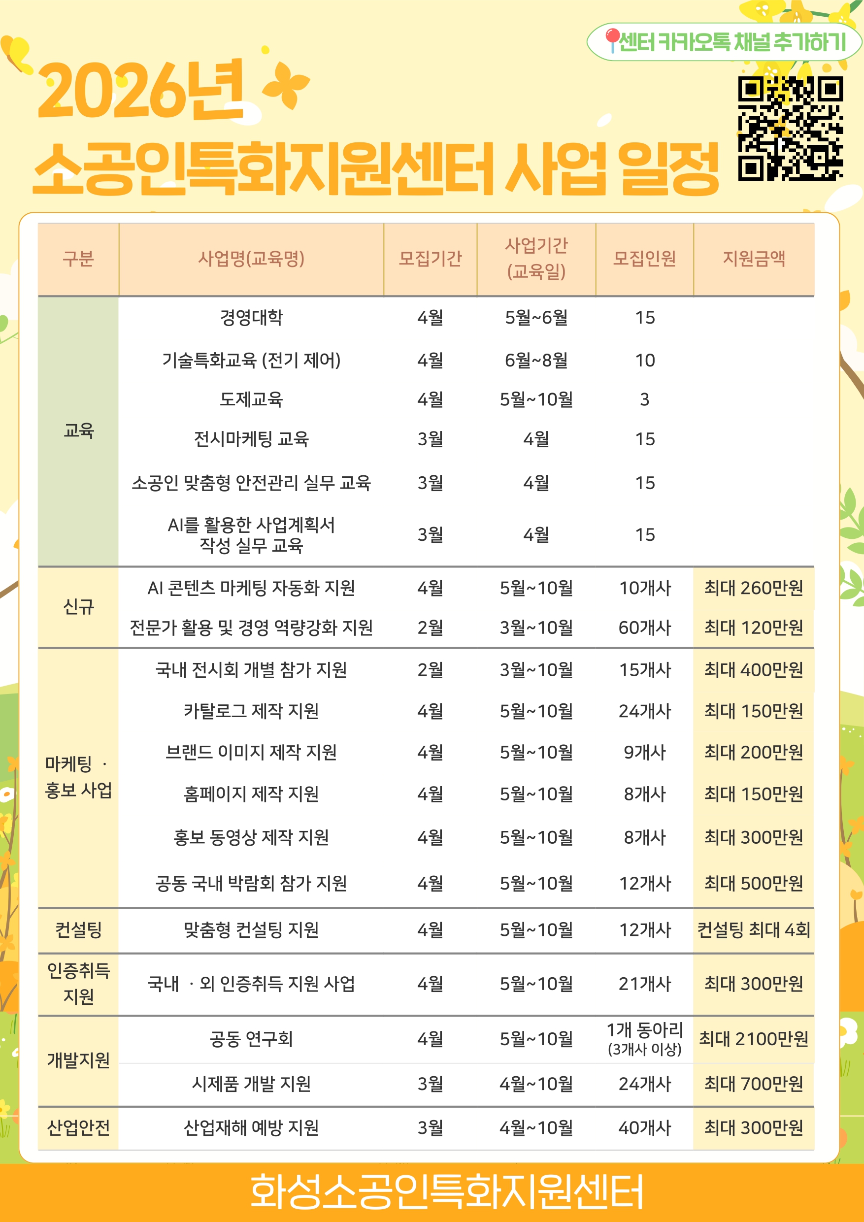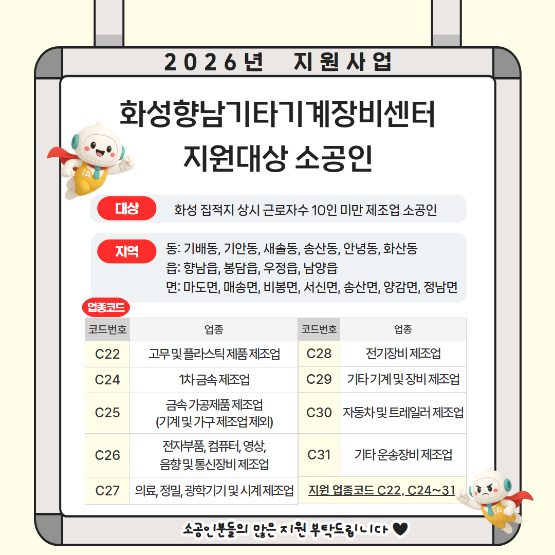 * 귀사의 일익 발전을 기원합니다. * 하단과 같이 2026년 소공인특화지원센터 지원 사업 요약본을 기재하오니 참고하여 주시기 바랍니다. * 해당 지원 사업은 기관 사정에 따라 변동될 수 있으며 추후 세부사업 게시물을 확인해 주시기 바랍니다. * 자세한 사업 일정은 추후 홈페이지 공고문으로 공지될 예정이오니 상세 문의는 031-354-3641로 연락주시기 바랍니다. 감사합니다. ![]()