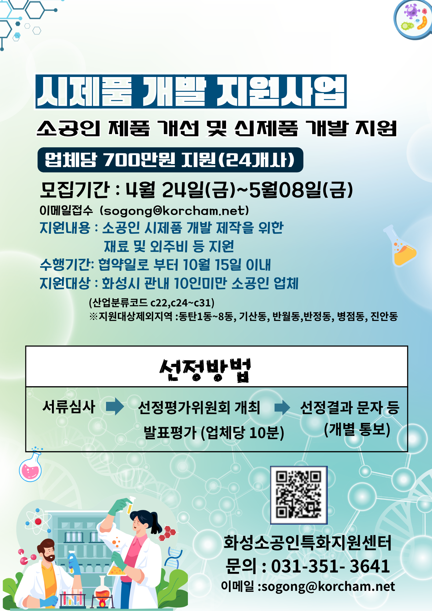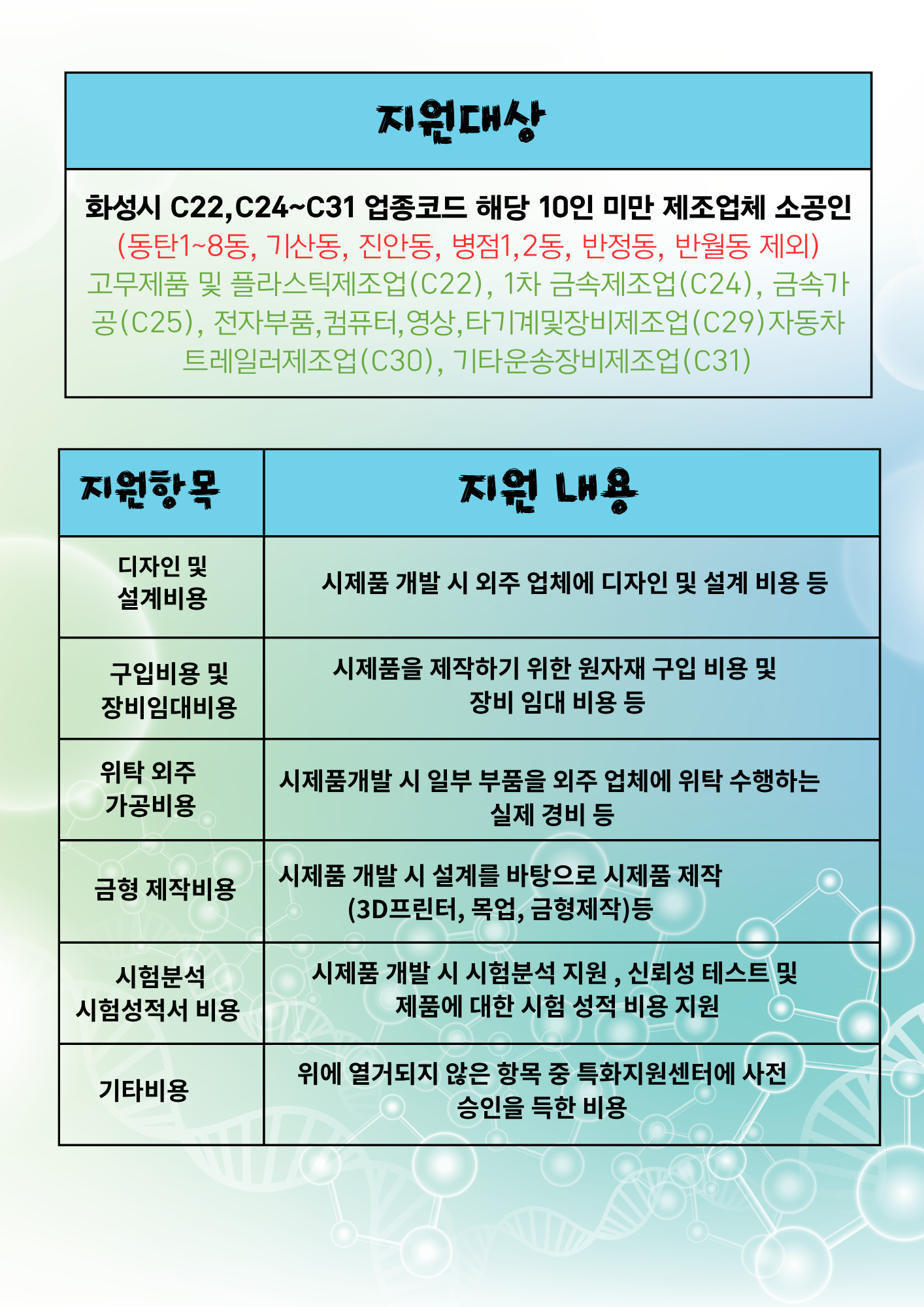 모집기간 : 2026년 5월 08일(금) ○ 지원대상 : 화성시 소재 소공인 (한국표준산업분류코드 C22, C24~C31 업종 지원가능) (기산동, 진안동, 병점1,2동, 반정동, 반월동, 동탄 1~8동 제외)
