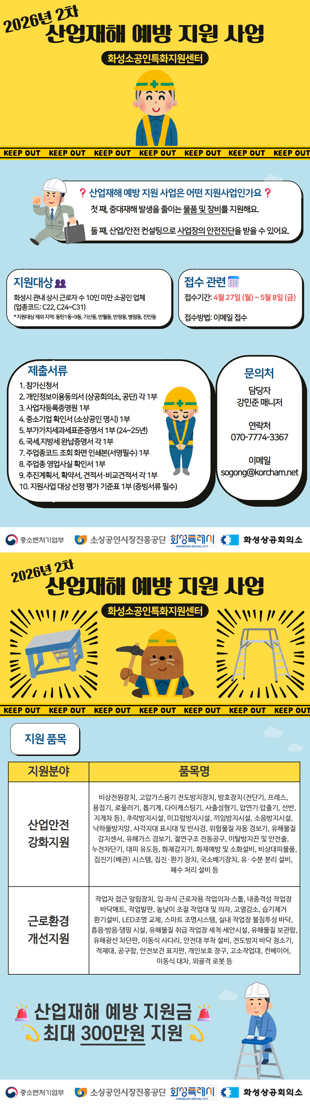 | ‒ | [모집] 2026년 『산업재해 예방 지원』 사업 2차 모집 안내 (~ 5. 8.까지) |