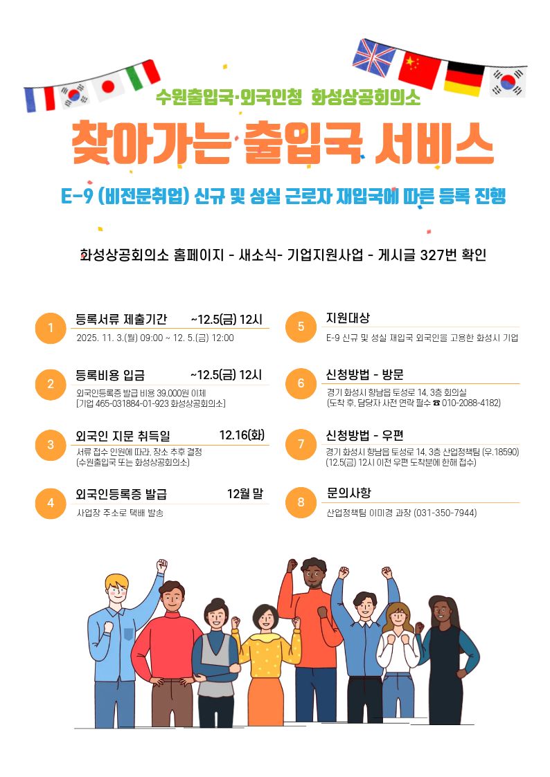 가. 지원내용 : E-9 신규 등록 및 성실근로자 재입국에 따른 등록 진행 (사증 발급, 체류기간 연장허가, 근무처 변경, 단순 재발급은 불가) 나. 지원대상 : E-9 신규 및 성실 재입국 외국인을 고용한 화성특례시 기업 다. 신청기간 ① 등록서류 제출기간 : 2025. 11. 3.(월) 09:00 ~ 12. 5.(금) 12:00 ※ 외국인등록증 발급 비용 39,000원 이체 후, 신청서 제출 (必) [계좌번호 : 기업은행 465-013884-01-923(화성상공회의소)] ② 외국인 지문 취득일 : 2025. 12. 16.(화) ※ 서류 접수 인원에 따라, 지문 취득 장소 추후 결정 (수원출입국 또는 화성상공회의소) ③ 외국인등록증 발급 : 12월 말 (사업장 주소로 택배 발송) ※ 미비한 신청서류 또는 출입국 업무상황에 따라 일정 변경 가능 라. 신청방법 : [홈페이지]-[새소식]-[기업지원사업]-[게시글 확인]-[비용 입금]-[신청서 작성]-[담당자(1인) 방문 또는 우편 제출] ① 방문 제출 : 경기 화성시 향남읍 토성로 14, 3층 회의실 ※ 도착 후, 담당자 사전 연락 필수 (산업정책팀 이미경 과장 010-2088-4182) ② 우편 제출 : 경기 화성시 향남읍 토성로 14, 3층 산업정책팀 (우:18590) ※ 2025. 12. 5(금) 12:00 이전 우편 도착분에 한해 접수