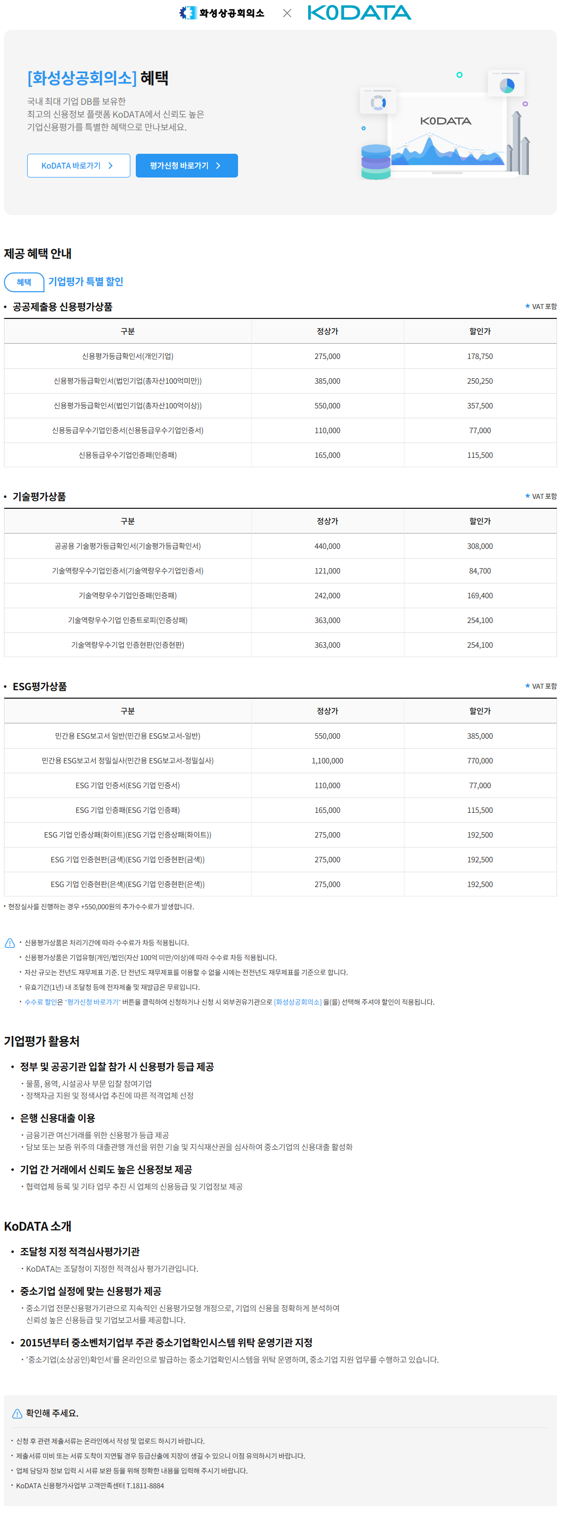 한국평가데이터(KoDATA)에서는 한국 공공제출용 신용평가상품,기술평가상품,ESG평가상품 등 화성상공회의소와 제휴하여기업평가 특별 할인 하오니 회원사의 많은 관심과 이용 바랍니다.