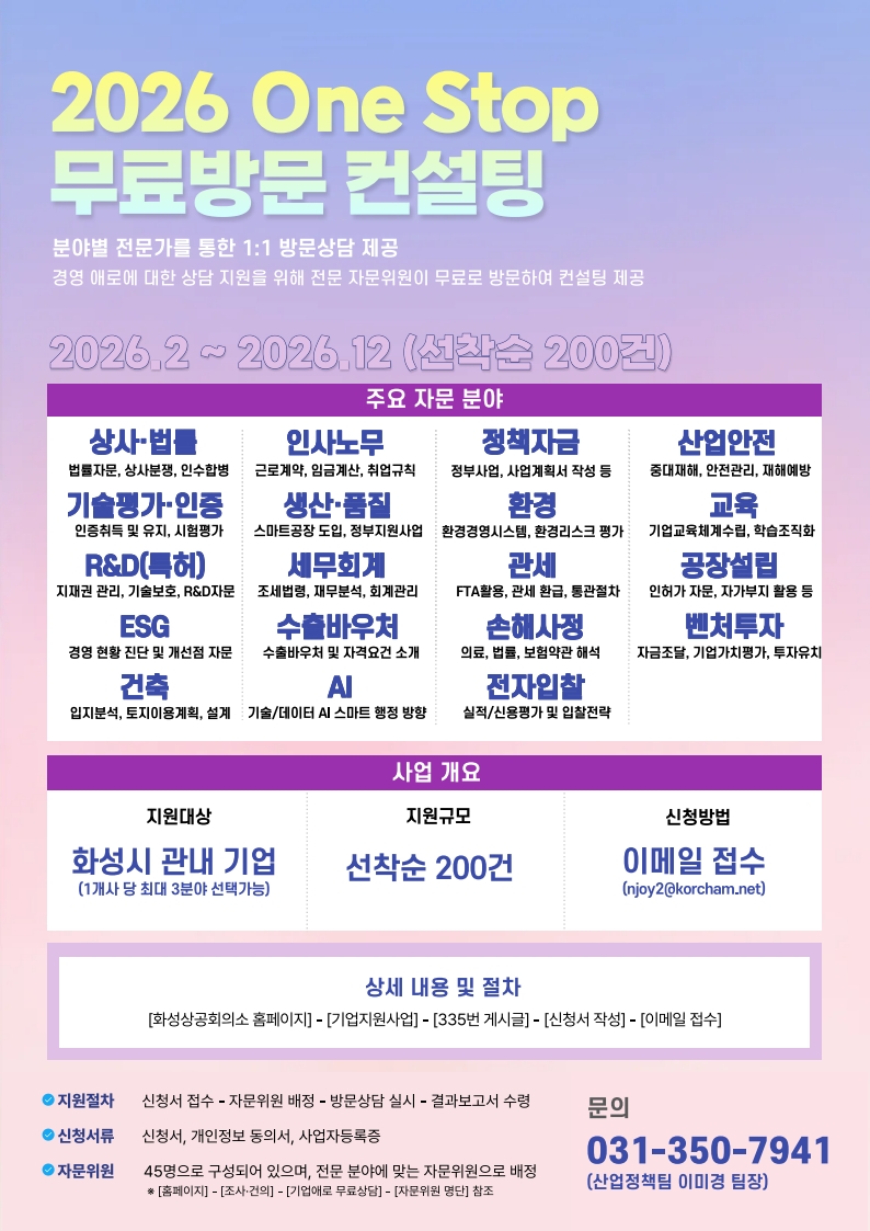 가. 대 상 : 화성시 관내 기업 나. 일 시 : 2026년 2월 ~ 2026년 12월(사업비 소진시 까지) 다. 장 소 : 신청기업 방문 라. 컨설팅비 : 무료 (1개사 당 최대 연 3건 지원) 마. 신청방법 : [홈페이지]-[기업지원사업]-[해당 게시물]-[이메일 신청] 바. 지원내용 : 기업 방문 전문경영상담 지원(기초 컨설팅) 사. 신청분야 (19개 분야)