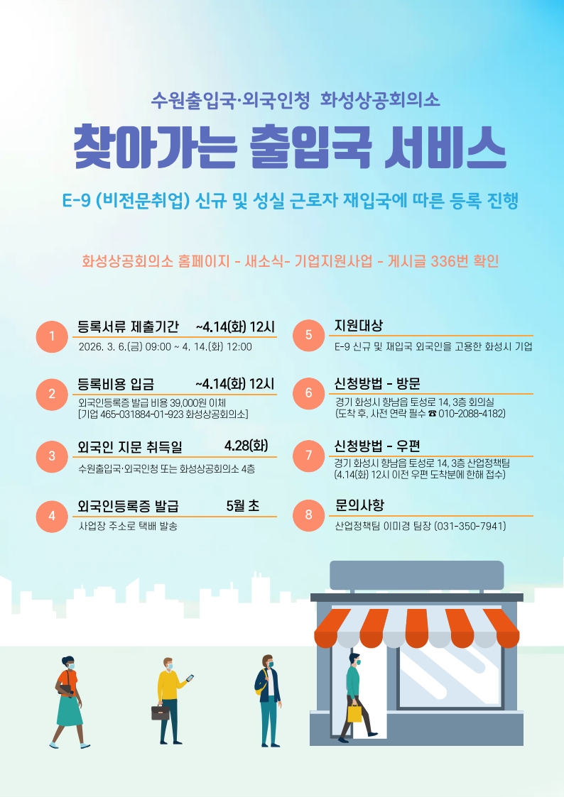 2. 화성상공회의소와 수원출입국·외국인청에서는 '2026 찾아가는 출입국 서비스'를 다음과 같이 시행하여 E-9 신규 발급 및 성실근로자 재입국에 따른 등록이 필요한 화성특례시 외국인 채용 기업을 지원하오니 접수 바랍니다.