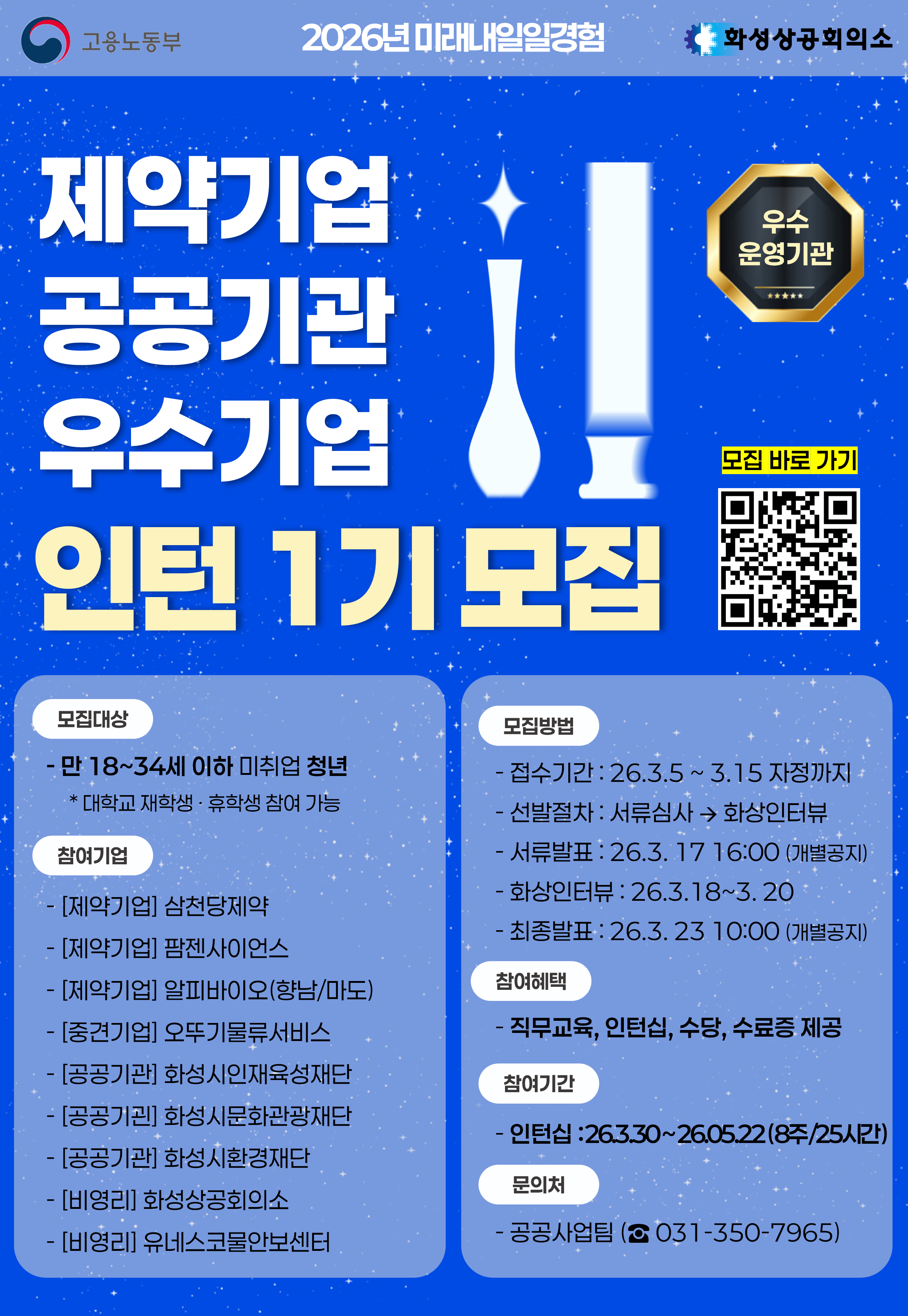 [중요공지] ※ 필수 제출 서류 (미첨부시 선발 제외될 수 있음) • [공통] 신청서 첨부파일란에 학력 증빙자료 업로드 • [공통] 자기소개란 최상단에 1~3순위(기업명+희망부서) 필수 기재 • [제약기업] GMP 이수증 또는 전공 수료 증빙자료 업로드 일경험 포털은 PC 이용 권장, 모바일은 브라우저에서 '데스크톱 사이트' 선택 후 접속 상세 내용은 첨부파일 공고문을 반드시 확인 바랍니다. ![]() 2026년 미래내일 일경험(인턴형) 1기 참여자 모집화성상공회의소는 직무경험 중심의 채용 환경에 대응하여 미취업 청년에게 직무교육 및 화성시 제약기업·우수기업·공공기관 인턴 경험을 제공하는 「2026년 미래내일 일경험(인턴형)」 1기 참여 청년을 모집하오니 많은 관심과 참여 바랍니다. 1. 프로그램 목록 및 참여기업 리스트 ▣ 제약기업 인턴 프로그램 [삼천당제약 외] 2026년 일경험 프로그램 1기