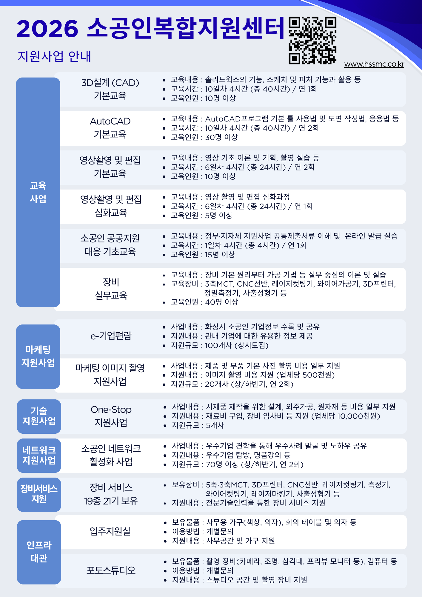 ▣ 지원대상 : 화성시 관내 상시근로자수 10인미만 제조업에 종사하는 소공인 업체. ▣ 지원업종 : 한국표준산업분류코드 C22, C24~C31 총 9개 업종 지원. ▣ 센터 상황에 따라 일정 및 지원사업 내용이 변경될 수 있습니다. ▣ 자세한 사업 일정은 추후 공지 예정입니다. - 문의: 화성 소공인복합지원센터 ☎ 031-296-7900